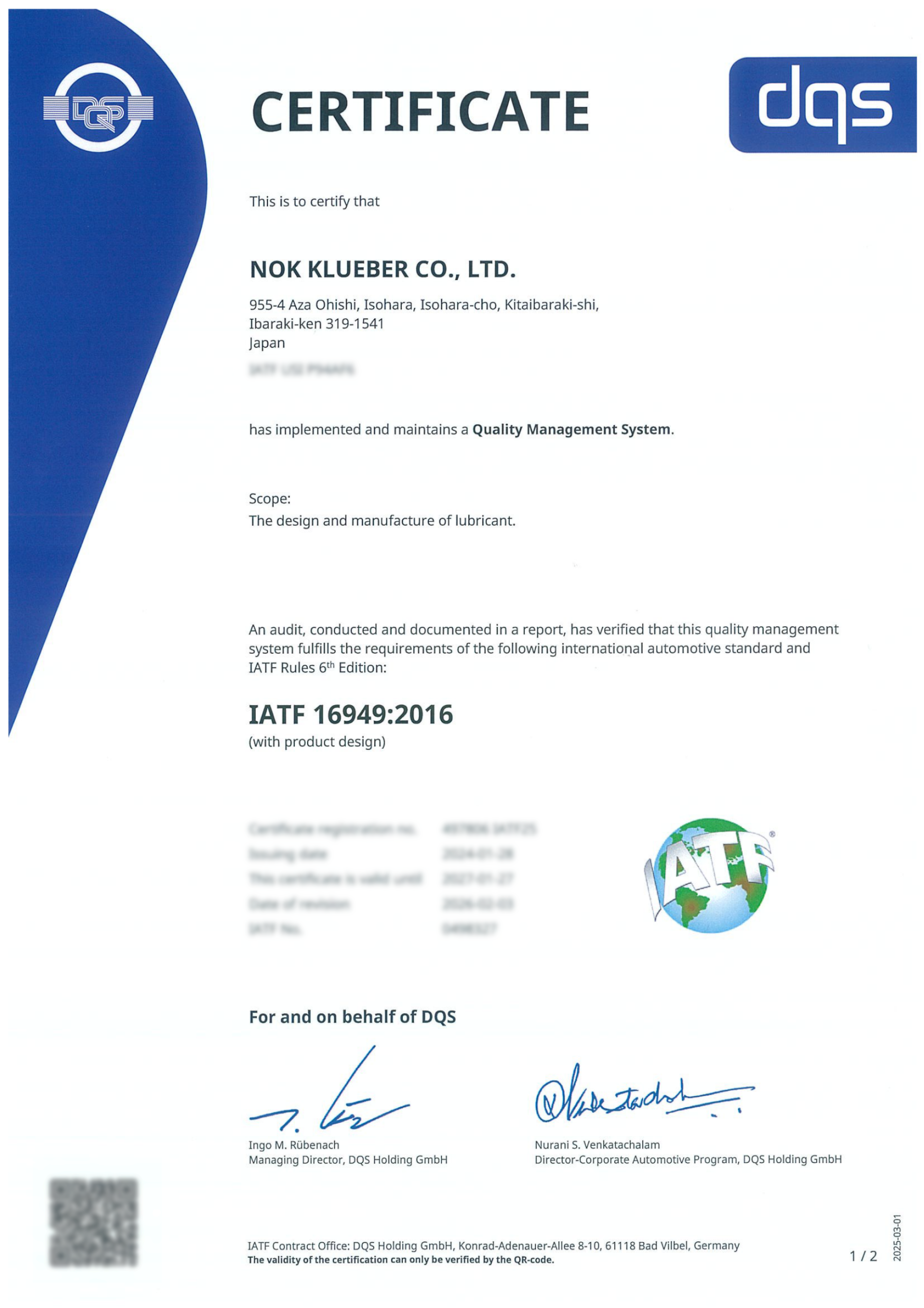 NOKクリューバーは2018年にIATF16949の認証を取得しました。
